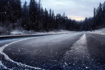 Black ice forming on a highway after freezing rain, making driving conditions extremely dangerous in the early morning hours
