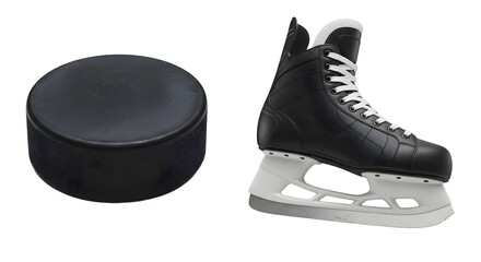 SPORT - Black ice hockey puck and skate isolated on white background, perfect for sports or hockey themed designs