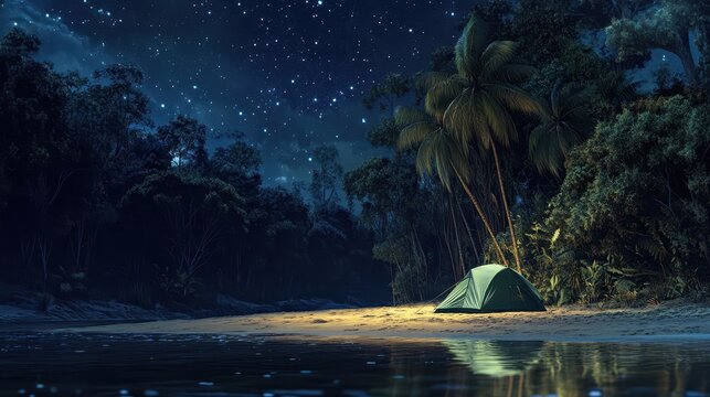 A lagoon surrounded by towering volcanic cliffs, with the vibrant green water contrasting against the black rock formations. Lava Lagoon. Illustration