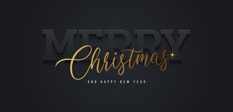 Merry christmas and happy new year lettering on black horizontal background. Luxury and elegant style black and gold text graphic design. Suit for poster, cover, banner, brochure, website, card