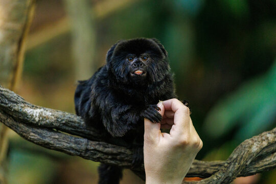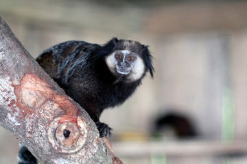 Close-up view of a black lion tamarin climbing the tree looking at the camera
