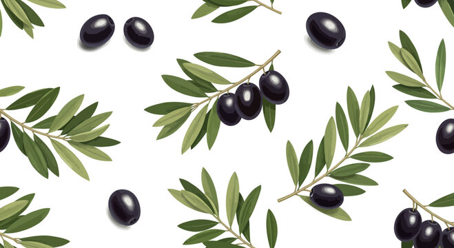 Seamless pattern of black olives with leaves on a white background, suitable for kitchen or food packaging