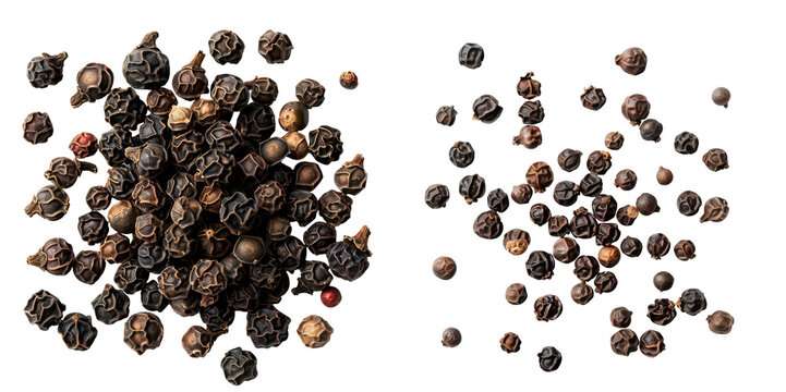 Black pepper pile or Black peppercorns seeds isolated on white background.