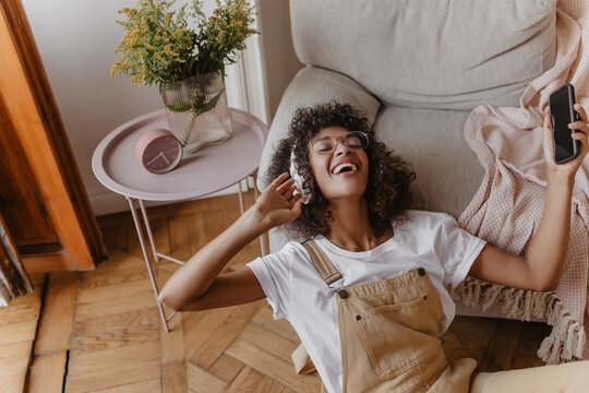 attractive relaxed girl sits on floor with her back on soft armchair. teenager happily listens to music with headphones closed his eyes. she has semi transparent glasses and black phone in her hand.