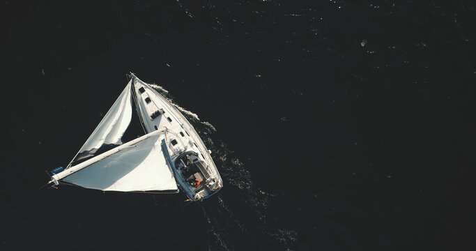 Top down of white sailing yacht on black water of ocean bay aerial. Nobody nature seascape at summer dusk day. Luxury yachting at open sea. Dramatic scenery of ship cruising at drone shot