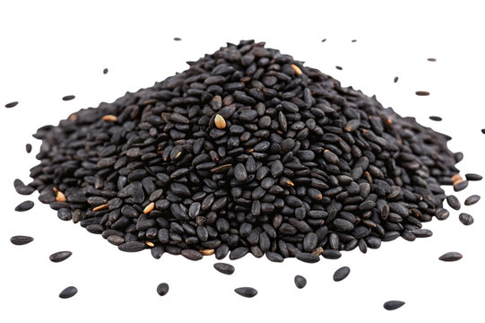 Sesame. Set of black and white sesame seeds. On a black background. Top view. Free copy space.