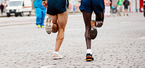 two runners kenyan and european running marathon, jogger run world championships race, soles running shoes