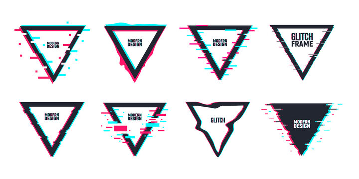 Vector set of geometric triangle frames in distorted glitch style. Set of triangle shape borders, covers. Modern background for posters, banners, flyers, covers.