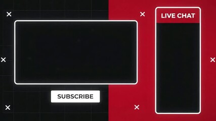 Live stream video game broadcast overlay template with subscribe button and live chat window modern red and black screen design for gamers and content creators