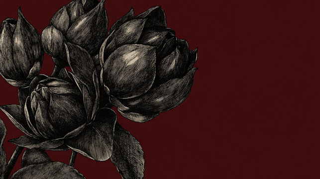 Elegant black and white illustration of blooming lotus flowers against deep red background, creating striking contrast that evokes sense of tranquility and beauty