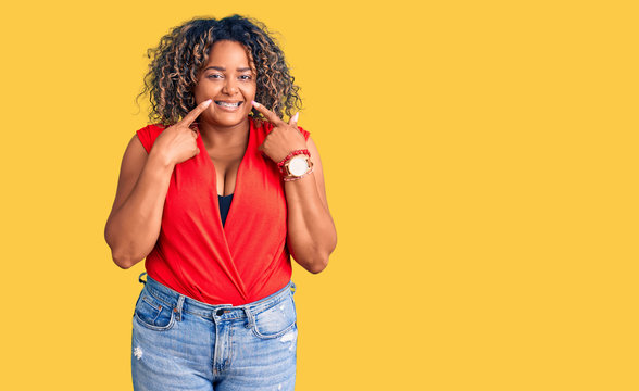 Young african american plus size woman wearing casual style with sleeveless shirt smiling with open mouth, fingers pointing and forcing cheerful smile