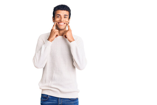 Young african amercian man wearing casual clothes smiling with open mouth, fingers pointing and forcing cheerful smile