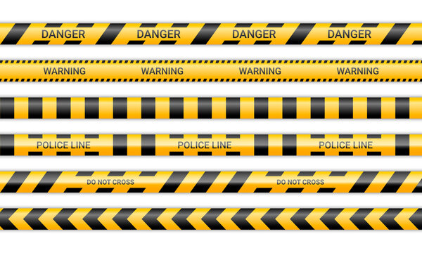 Police lines and don't cross ribbons. Caution and danger tapes in yellow and black color. Warning signs collection isolated on white background. Vector illustration