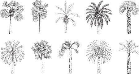 Ten different hand drawn botanical palm tree in monochrome line