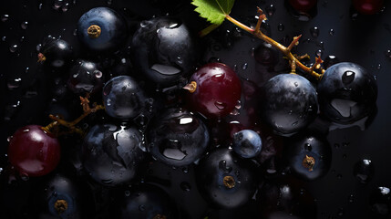 Fresh ripe blackcurrant with water drops background. Berries backdrop. Generative AI