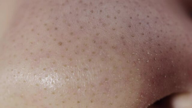Oily skin on the nose of a person with blackheads and acne. Facial skin care, dermatology, macro