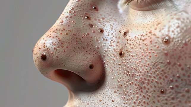 A realistic and detailed 3D render of a nose with blackheads and acne