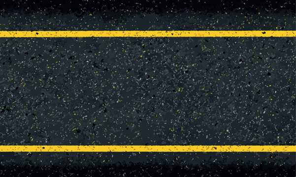 Asphalt road with yellow stripes, concrete highway surface, texture. Blacktop texture. Asphalt road blacktop background. Rough road black surface. Black texture of wet asphalt on the road.