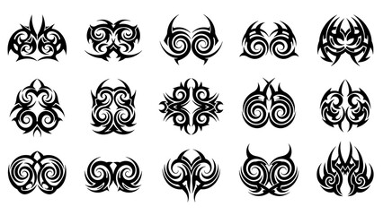 Dynamic collection of intricate tribal ornamental designs, showcasing a diverse range of powerful blackwork patterns and symmetrical swirling motifs, ideal for graphic projects and symbolic body art