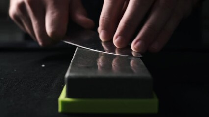 Chief Hands Sharpening Kitchen Knife With Whetstone On A Kitchen Table