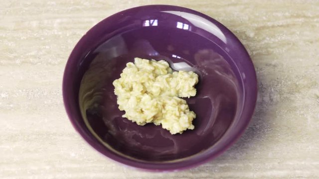 Metal spoon serving steaming hot oatmeal into a purple ceramic bowl on a plain table for breakfast