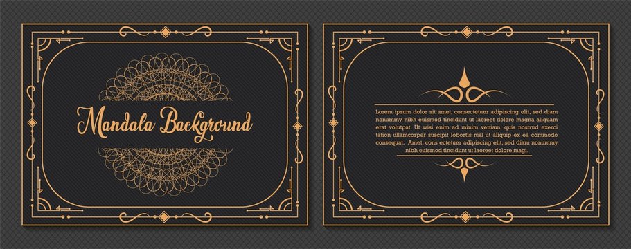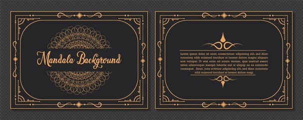 Business card with gold mandala and monogram on black background. Vector illustration.