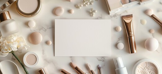 Flat lay of makeup products with a blank card in the center, suitable for a beauty-themed message or advertisement on a marble surface.