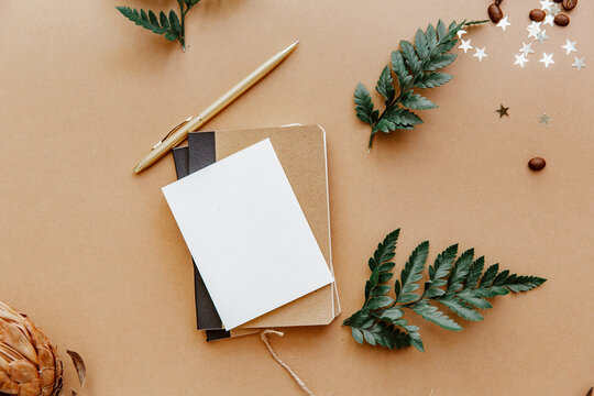Brown blogger background with note and blank card. Todo list, planning concept, mock up