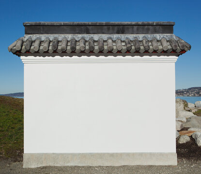 A blank wall painted white, with a layer of curved roof tiles, part of a pagoda or a blank wall.