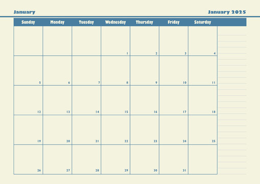 January 2025 planner with note, taking sections and a neat table design