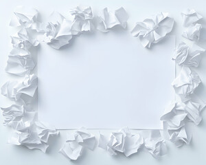 Blank paper sheet surrounded by crumpled white papers. Work progress, idea