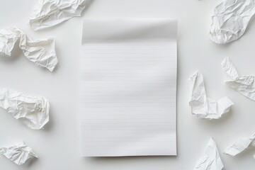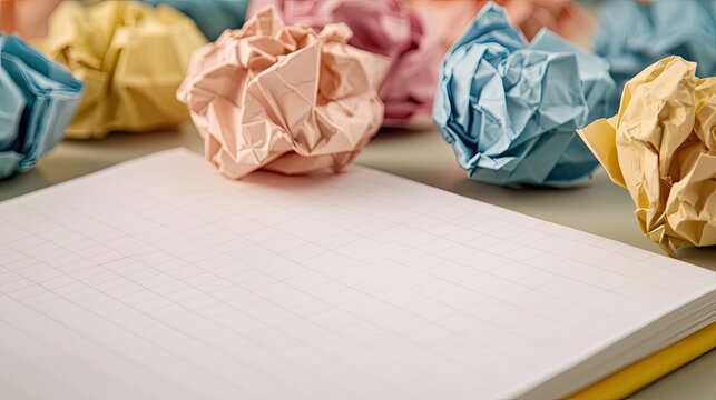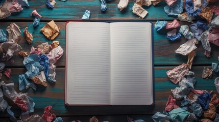 Blank Notebook Surrounded by Crumpled Papers: A Symbol of New Beginnings and Fresh Ideas