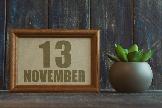 november 13th. Day 13 of month, date in frame next to succulent on wooden background autumn month, day of the year concept