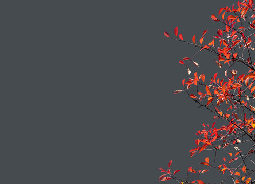 Branches of trees with bright red autumn leafy on gray background. Minimalist fall composition with copy space.