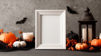 White blank picture frame mockup on Halloween themed surface with orange and black decorations around