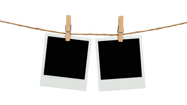 Two blank Polaroid photo frames clipped to a rope with wooden pegs, isolated on transparent background, perfect for nostalgia-themed designs, scrapbooks, or memory placeholders.