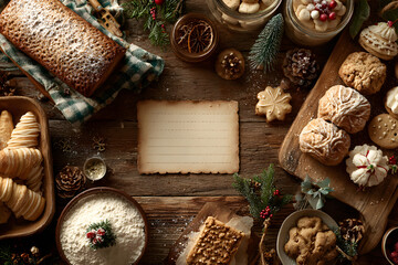 Bakery background for cooking christmas baking decorated with fir tree and old empty blank for recipe top view.
