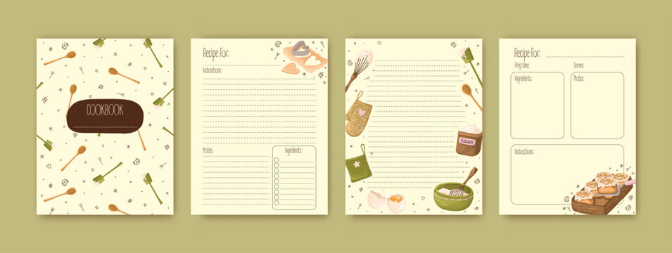 Templates for a cozy recipe book. The blank pages for your recipes. Cookbook. Vector.