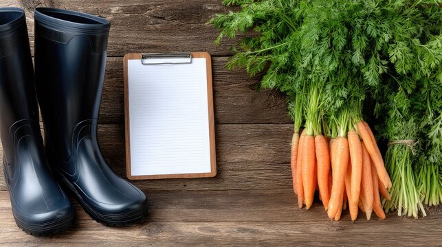 Pair of Santa's shoes rests beside a burlap sack filled with fresh carrots and a blank clipboard on a wooden table, creating a festive holiday atmosphere.