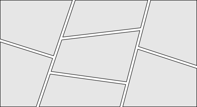 Dynamic comic book panel layout template for graphic design resources, featuring an abstract, modern, and asymmetrical geometric storyboard grid structure, perfect for blank creative project backgroun