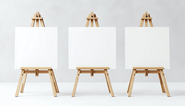 three wooden easels with white blank canvases. Art boards stand ready for painting artwork or displaying creative projects