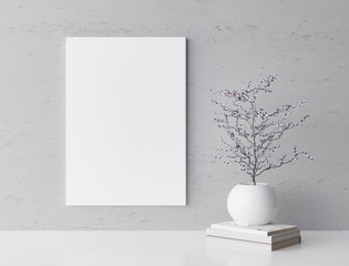 White canvas frame mock up template square size on white wood wall for arts painting and photo hanging interior decoration