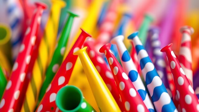 Colorful party horns arranged in a vibrant pattern, evoking festive celebration and joy.