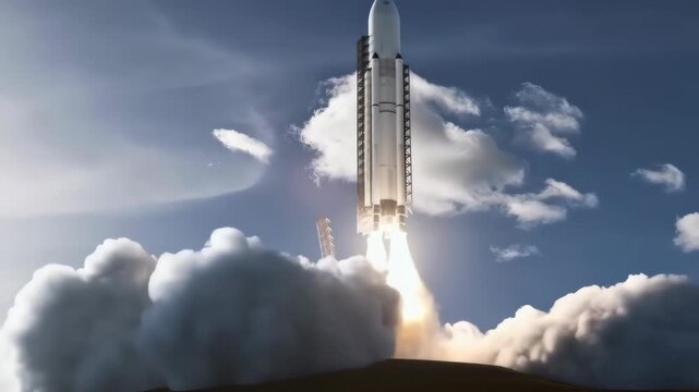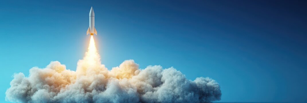 White rocket blasting off into clear blue sky with bright fiery exhaust and thick clouds of smoke below during liftoff