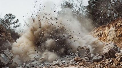 Dust clouds and rock particles during dynamite blasting