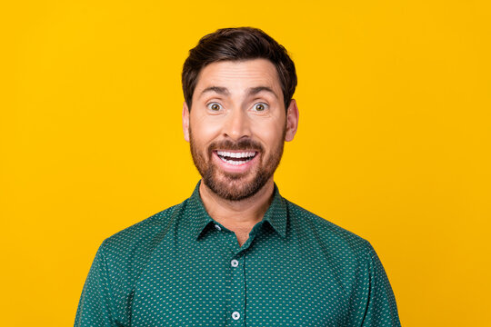 Photo of impressed man with brunet hair dressed dotted shirt astonished staring at sale isolated on vibrant yellow color background