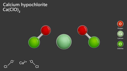 Molecule: Calcium Hypochlorite. Bleaching agent. Molecular structure. Formula: Ca(ClO)2. Chemical model: Ball and stick. Gray background. 3D illustration.