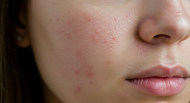 icepick scars acne on cheek on face women cause of happen because of skin loses collagen, so the overlaying skin collapses and leaves a hole, narrow and deep using for cream or skin care product conce