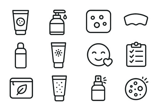 Teen Skincare Icons. Outline icon set of skincare for teens: acne cream, face wash, blemish patch, pore strip,