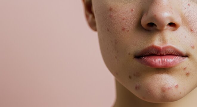 A close-up of a face showing acne and skin blemishes against a soft, pink background.